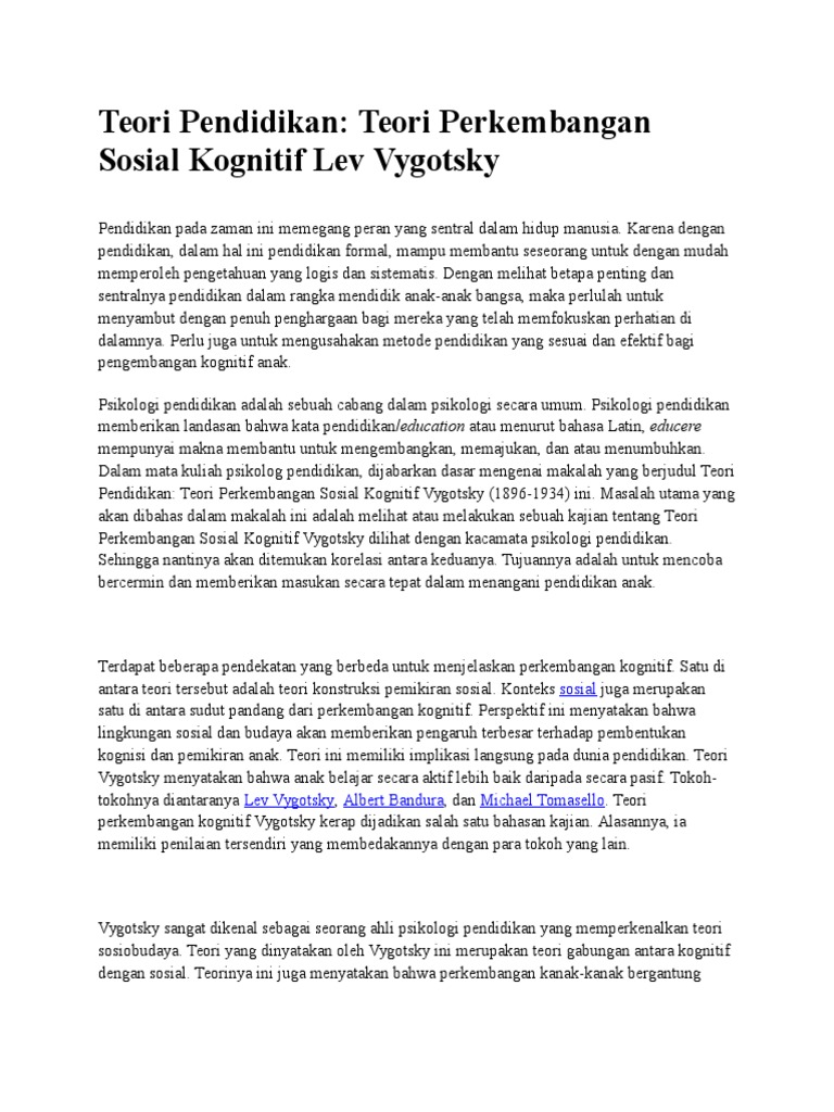 Lev vygotsky memberi tumpuan kepada sumbangan penting yang diberikan masyarakat terhadap perkembangan individu dalam teori perkembangan kognitif sosiobudaya. Yaitu rasa kesadaran sosial adalah yang utama dan rasa individualnya. Powerpoint presentation teori perkembangan kognitif dan bahasa lev vygotky disediakan oleh: Perkembangan kognitif teori lev vygotsky. Bagi vygotsky, perkembangan anak pada masa awal klaim ketiga vygotsky menyatakan bahwa kemampuan kognitif berasal dari hubungan sosial dan kultur. Documents similar to teori perkembangan kognitif lev vygotsky. Secara khusus vygotsky mengemukakan bahwa disamping guru, teman sebaya juga berpengaruh penting pada perkembangan kognitif anak.berlawanan dengan pembelajaran lewat penemuan. Mereka berpendapat bahwa bahasa hanya merupakan urutan. 2.1 pengenalan kepada teori perkembangan kognitif jean piaget. 3 menurut vygotsky budaya dan komunitas dalam belajar memiliki peran penting. Teorinya memberikan banyak konsep utama dalam lapangan psikologi perkembangan dan berpengaruh terhadap perkembangan konsep kecerdasan, yang bagi piaget. Teori ini biasa juga disebut teori perkembangan intelektual atau teori perkembangan kognitif. Konsep sosio kultural lev semonovich vygotsky.