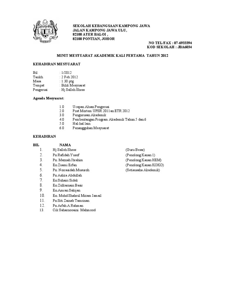 Minit mesyuarat merupakan satu laporan mengenai perkara atau hal yang dibincangkan dan diputuskan dalam sesuatu mesyuarat. Semua guru yang mengajar sebelum waktu rehat dan balik mesti pastikan bahawa kipas dan lampu ditutup. Format penulisan minit mesyuarat pengenalan 1. Dalam erti kata lain, mesyuarat tidak boleh dikendalikan oleh seorang individu sahaja. Minit disediakan oleh setiausaha mesyuarat atau urus setia. Pengesahan minit mesyuarat yang lalu. Minit mesyuarat adalah laporan mengenai perkara yang dibincangkan atau diputuskan dalam sesuatu mesyuarat. Jika tiada catatan, segala perbincangan tidak akan ada tindakan susulan. Tajuk utama perkara berbangkit yang dibincangkan hendaklah dicatatkan. Pengurusan penilaian pbppp adalah secara dalam talian melalui laman web. Dalam pengurusan pinjaman peribadi atau pinjaman koperasi, pengerusi memberi peringatan mesra kepada semua bahawa segala kelulusan, kebenaran atau tanda tangan perlulah melalui pihak beliau. Perkara paling asas dalam mesyuarat adalah sekumpulan orang. Minit mesyuarat penting kerana minit merupakan sumber rujukan masa hadapan.